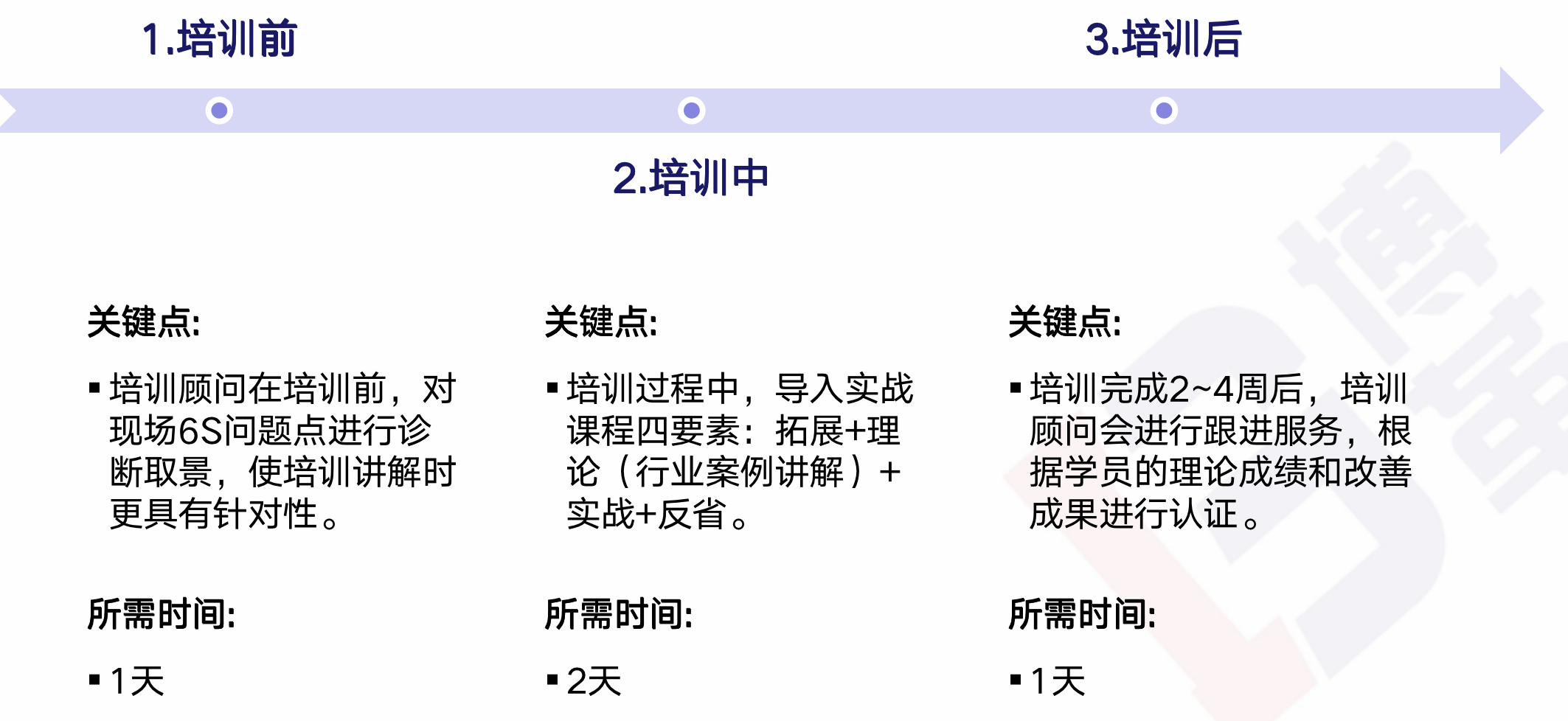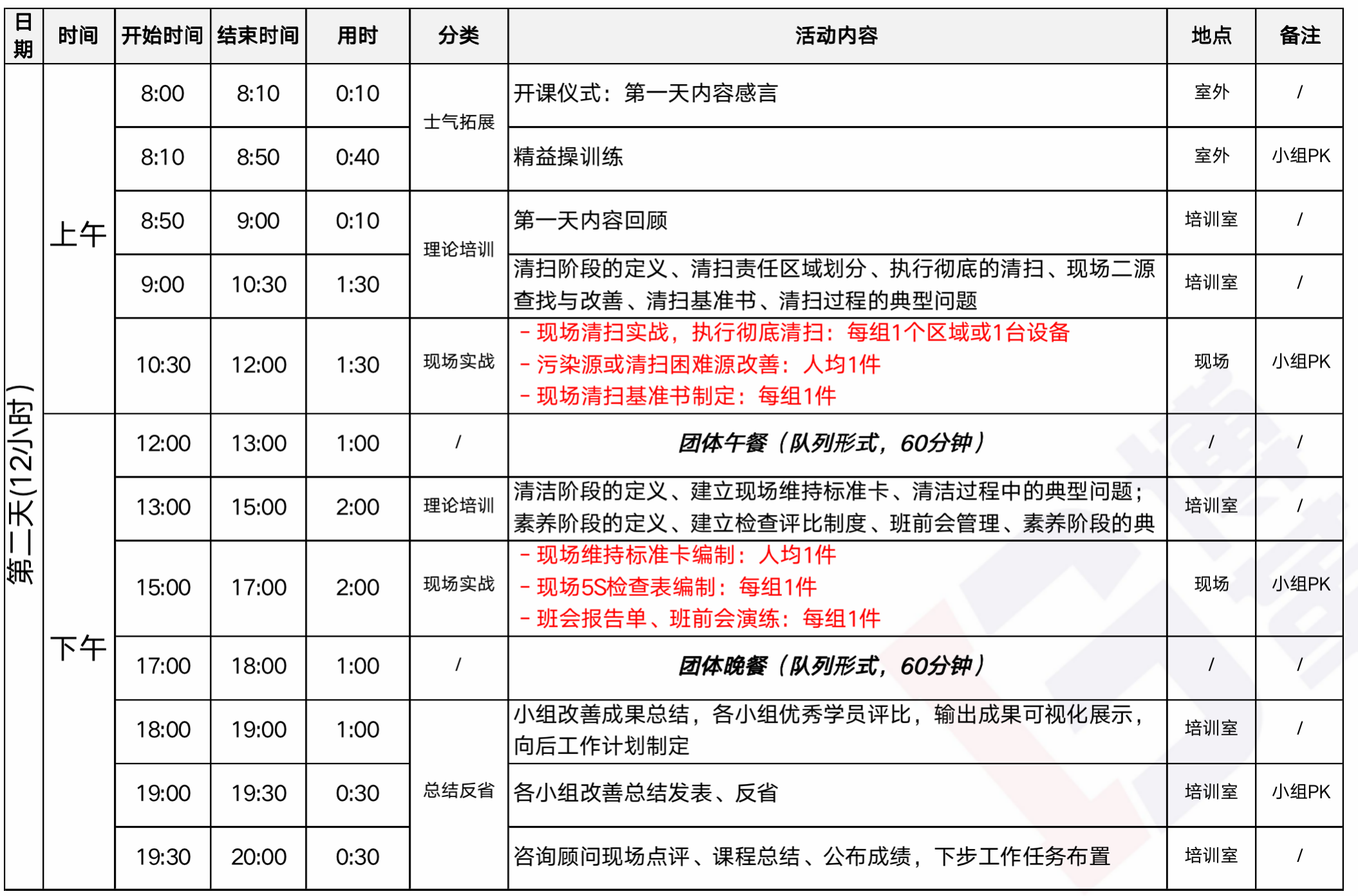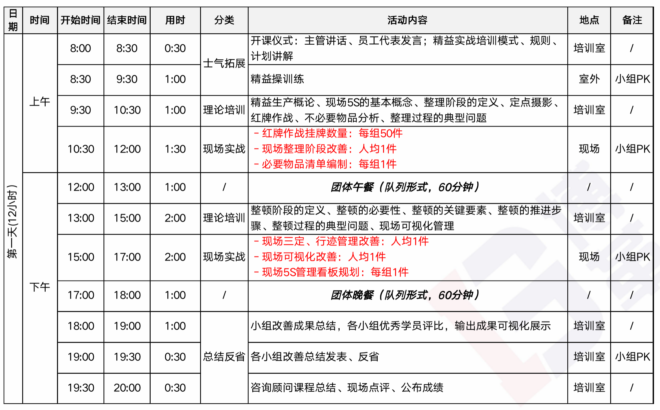 每次培訓會根據企業的需求選擇不同的主題,包含但不限于:現場6S、TPM、標準作業、六源改善、質量改善、快速切換、產線平衡、工位布置、浪費識別與改善、QC/IE工具應用等