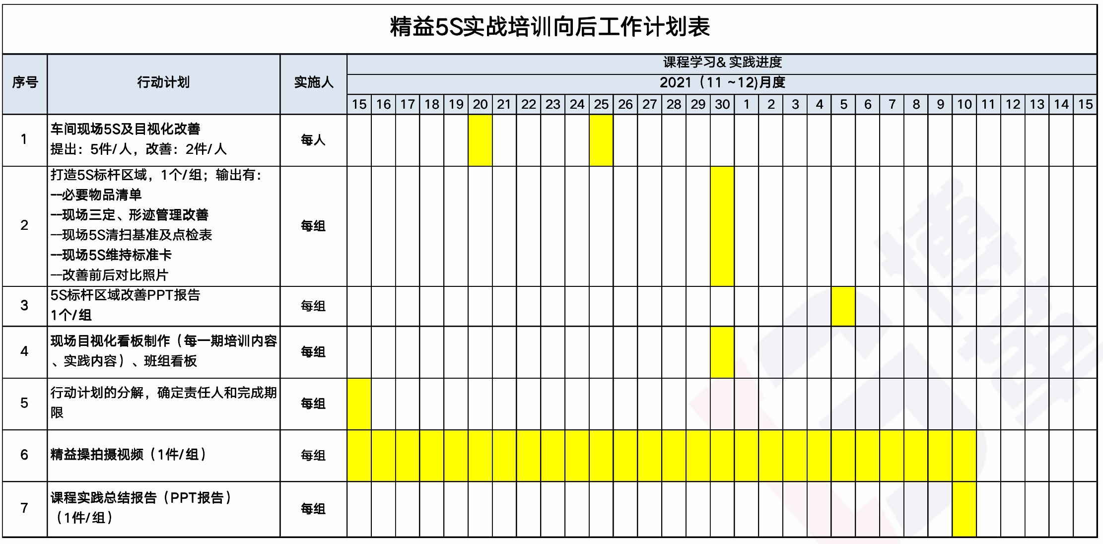在精益管理的導入階段需要導入精益實戰培訓,并且要持續進行,形成公司的輪訓制度;每次培訓結束之后需制定下步的工作計劃,使精益實戰培訓閉環。
