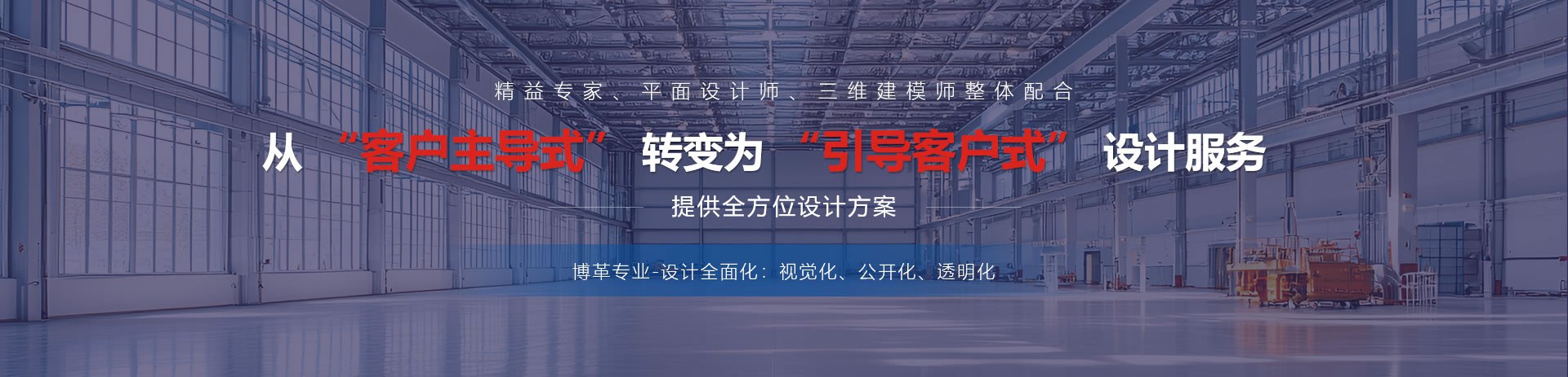 “空間視覺設計”是由精益專家、平面設計師、三維建模師整體配合,從“客戶主導式”轉(zhuǎn)變?yōu)?ldquo;引導客戶式”設計服務,在安全管理、現(xiàn)場管理、參觀展示等多角度,打造『視覺化、公開化、透明化』的工廠的服務。
