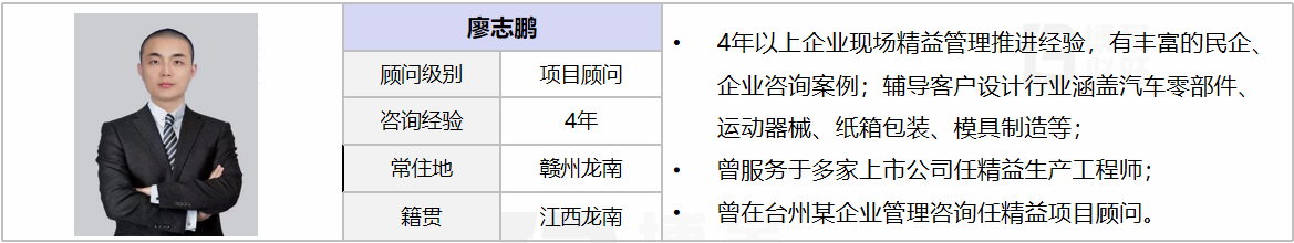 擅長(zhǎng)業(yè)務(wù):工廠前期調(diào)研診斷、項(xiàng)目管理、現(xiàn)場(chǎng)基礎(chǔ)管理提升、精益布局規(guī)劃、大型倉(cāng)儲(chǔ)規(guī)劃、改善項(xiàng)目落地、IE改善手法、質(zhì)量管理、QCD降本增效改善、精益生產(chǎn)配送管理、精益生產(chǎn)項(xiàng)目的推進(jìn)、標(biāo)準(zhǔn)工時(shí)開發(fā)、SMED快速換模換線、現(xiàn)場(chǎng)5S改善、與目視化提升、基層培養(yǎng)-打造班組管理、精益體系建立及改善輔導(dǎo)實(shí)施跟進(jìn),KAIZEN持續(xù)改善、流程再造,3P、定制化生產(chǎn)線搭建,非標(biāo)工裝自動(dòng)化設(shè)備開發(fā)與導(dǎo)入。