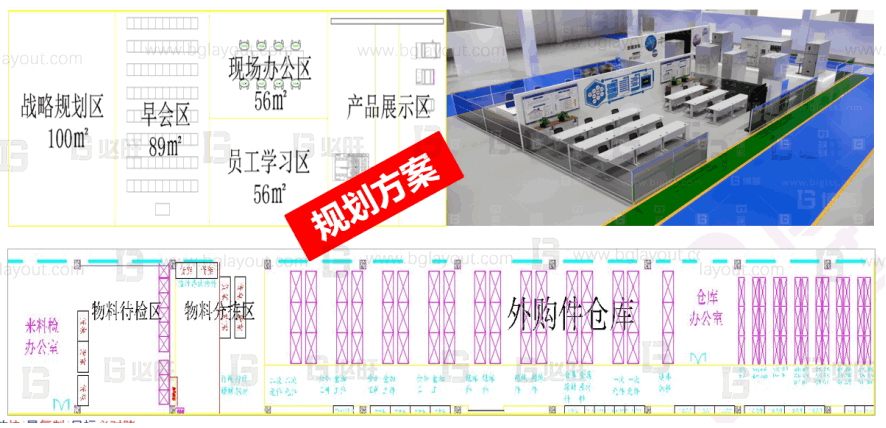 本規劃項目涉及對工廠進行整體布局規劃及目視化管理設計,規劃內容包含對車間進行智能精益布局、車間功能細化、倉庫規劃、物流及輔助設施規劃等服務內容,可滿足未來公司高速發展的需求。