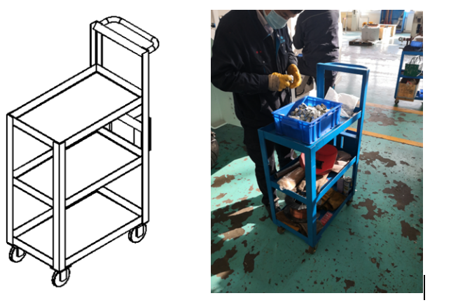 通過(guò)征求一線員工意見(jiàn),確定工具小車(chē)的形式和功能,經(jīng)使用后效果很好,能夠減輕工人工作強(qiáng)度,并能節(jié)約物料搬運(yùn)時(shí)間。