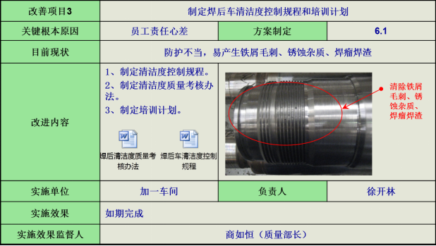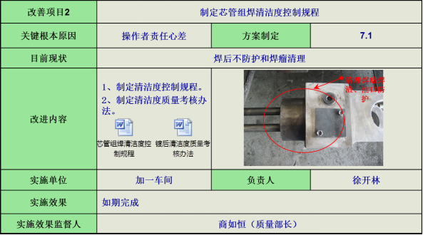 5)芯管組焊方法,針對芯管焊后不防護和焊瘤清理問題,制定芯管組焊清潔度控制規程。
