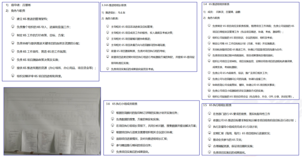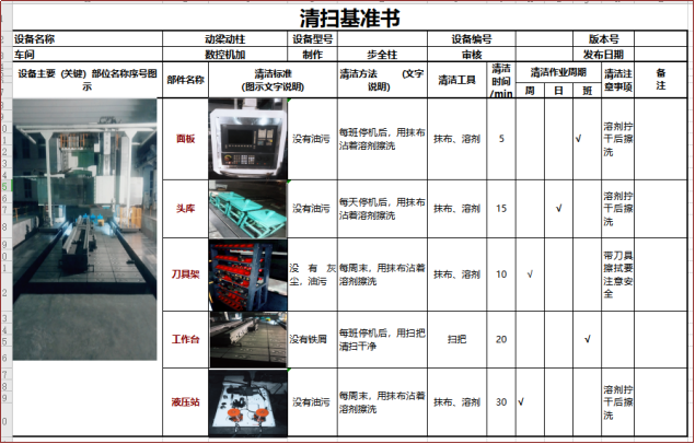 為打造標準化工廠,推動精益生產,全員改善,需從6S項目開始,通過精益顧問的培訓輔導和檢查,推進了公司內6S組織及職責建設,打造并推廣了樣板車間,完成了單點教材OPL,設備六源分析和改善,建立了設備清掃基準書及維持基準卡,建立了6S周會及早會制度,完善了6S相關制度及手冊。