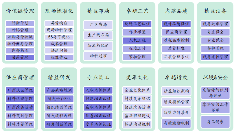 XPS根據(jù)A集團(tuán)及所處行業(yè)的特點(diǎn),建構(gòu)其獨(dú)具特色的模型,以A集團(tuán)十二五戰(zhàn)略目標(biāo)為愿景,制定了世界級(jí)企業(yè)關(guān)注的5大目標(biāo),工程機(jī)械行業(yè)運(yùn)營(yíng)中最重要的12大模塊,提煉出58項(xiàng)要素和235項(xiàng)要求。