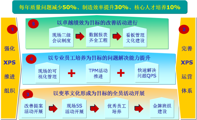 XPS系統(tǒng)架構(gòu)分由理念、原則、模型、目標(biāo)、要素、要求部分構(gòu)成,其理念為:“XPS-A持續(xù)變革系統(tǒng)”是以A集團(tuán)及下屬企業(yè)戰(zhàn)略為導(dǎo)向,結(jié)合企業(yè)運(yùn)營(yíng)的具體情況,運(yùn)用世界上最行之有效的績(jī)效改善工具和方法,幫助企業(yè)建立和完善高效的運(yùn)營(yíng)系統(tǒng)和模式-XPS持續(xù)變革系統(tǒng),使企業(yè)在產(chǎn)品創(chuàng)新、流程創(chuàng)新、人才培養(yǎng)、利潤(rùn)創(chuàng)新等方面的績(jī)效達(dá)到世界領(lǐng)先水平,并形成與企業(yè)自身文化相融合的持續(xù)改善文化,構(gòu)筑企業(yè)的核心競(jìng)爭(zhēng)力。“