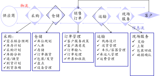 通過梳理醫藥物流的關鍵環節,分析關鍵流程(供應商管理、采購、倉儲、銷售訂單、運輸、現場服務)的績效指標設置及表現進行診斷: