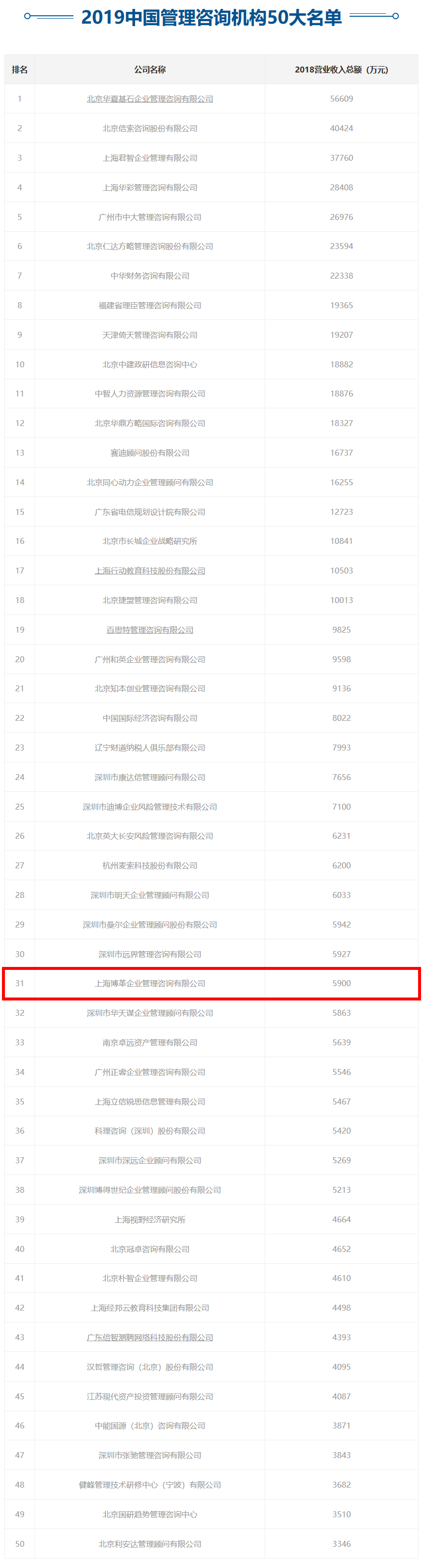 【喜訊】博革咨詢榮登“2019中國管理咨詢機構(gòu)50大名單”第31位!