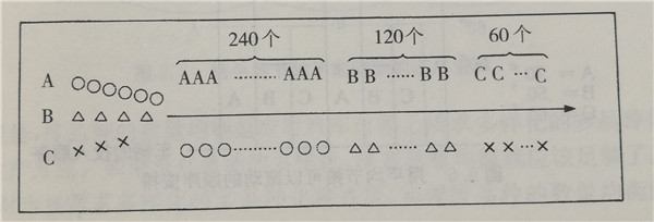 于是,如果用節(jié)拍時間制造所有的品種,每種產(chǎn)品都要用全部車種的平均節(jié)拍時間來制造,而每種產(chǎn)品的節(jié)拍時間在編排各種產(chǎn)品的順序時考慮就可以了。在豐田汽車公司為了均衡生產(chǎn)面編排的順序,就像圖1那樣。